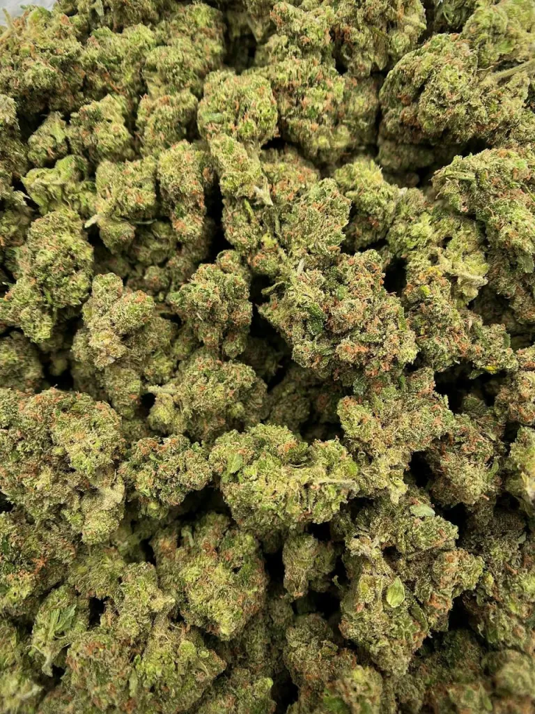 Dense, resinous buds with vibrant green coloration and orange pistils.