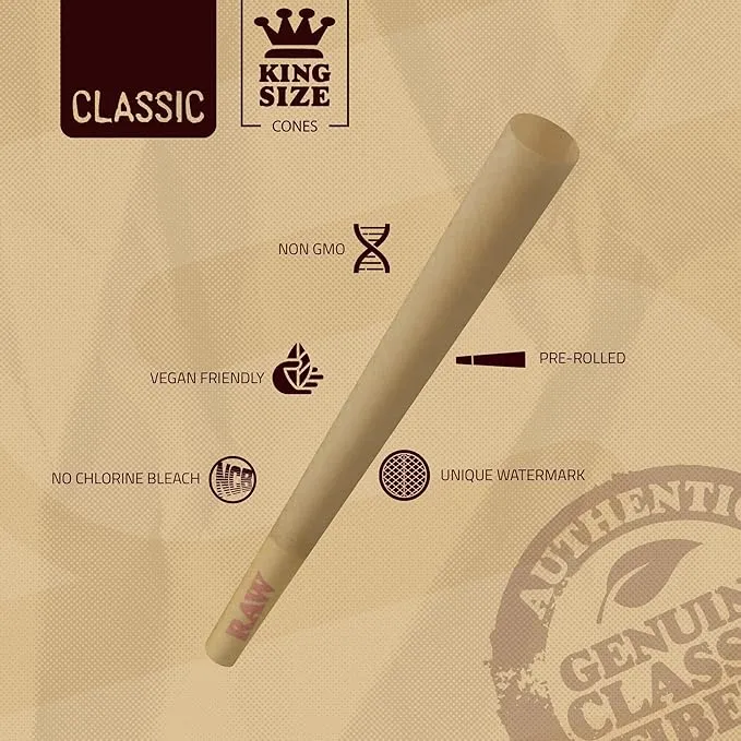 Pre-rolled cones in the RAW Pre-Rolled Papers King Size offer the utmost convenience. Expert craftspeople craft these cones from all-natural, unbleached fibers to ensure a consistent, smooth burn. They are easy to fill and use because they are pre-rolled with tips, making them ideal for both novice and experienced smokers. Cones are perfect for sharing or working alone because each one can hold up to 1.25 grams.