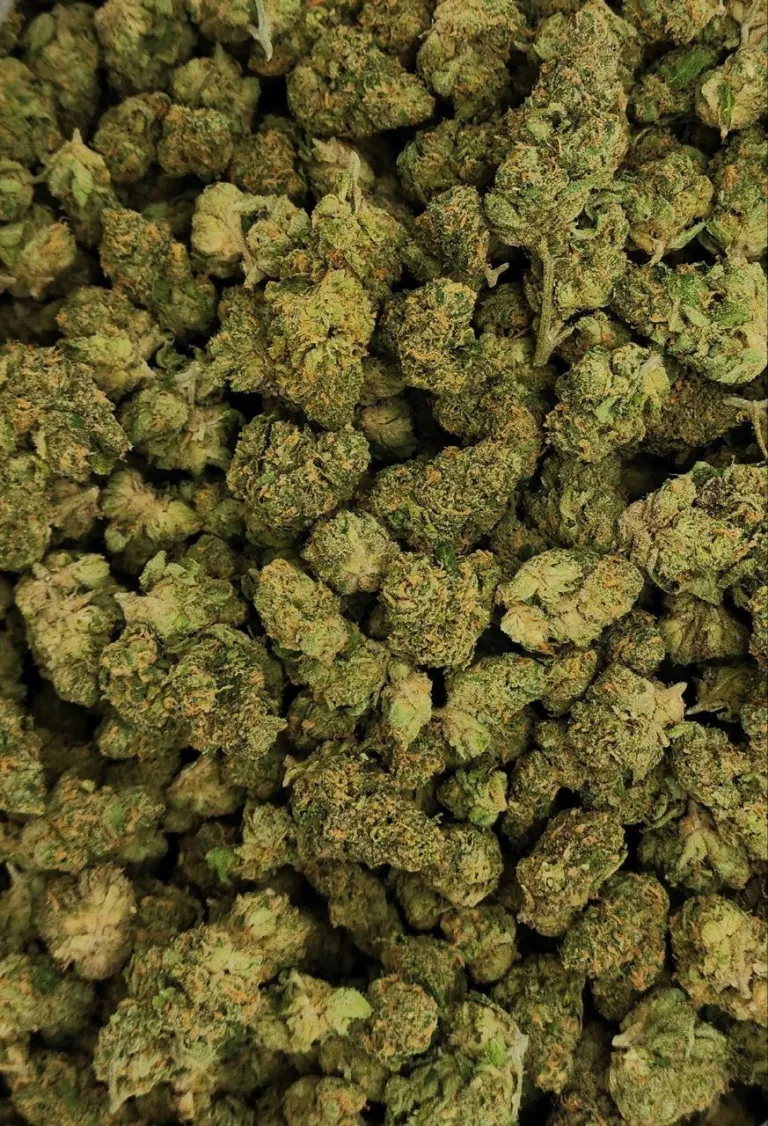 Dense, resinous buds; vivid green with yellow undertones. A thick layer of trichomes that sparkle; and fiery orange pistils all over